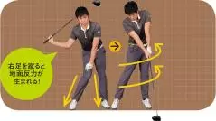 左足の踏み込みと右足を蹴るように使うと、いわゆる地面反力が生じる。このパワーを回転に転化できるとインパクト付近でジャンプするような動きが出る。