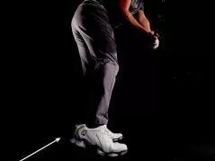 ダウンスイングで左腕と地面が平行になったところで、もう一つ行われるのが、右足で地面を蹴るようにする動き。ヒップターンの速さと強さが増幅される。