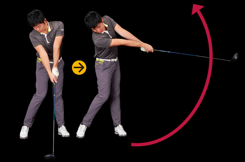 飛ばし屋には、手首のコックを使う人と抑える人がいますが、チャンプは後者。テークバックでヘッドを低く動かし、バックスイングでも積極的にはコックしません。肩から先を1本のクラブに見立てて振る感じです。