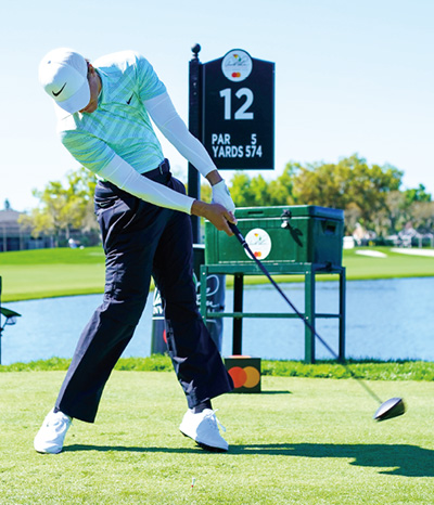 ダウンスイング時に手首をリリース、タメを解放して飛ばすのが通常の手法。だが、体の回転が速いチャンプは、あえて手首をリリースせず、肩から先を1本のクラブのように使って打ち抜く。
