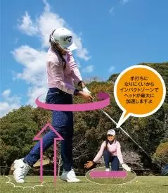 体主体のスイングになるので、ダウンスイングでスピードが減速してしまう手打ちと違い、インパクトゾーンでヘッドが最大加速を迎える。飛距離アップには欠かせない要素だ。