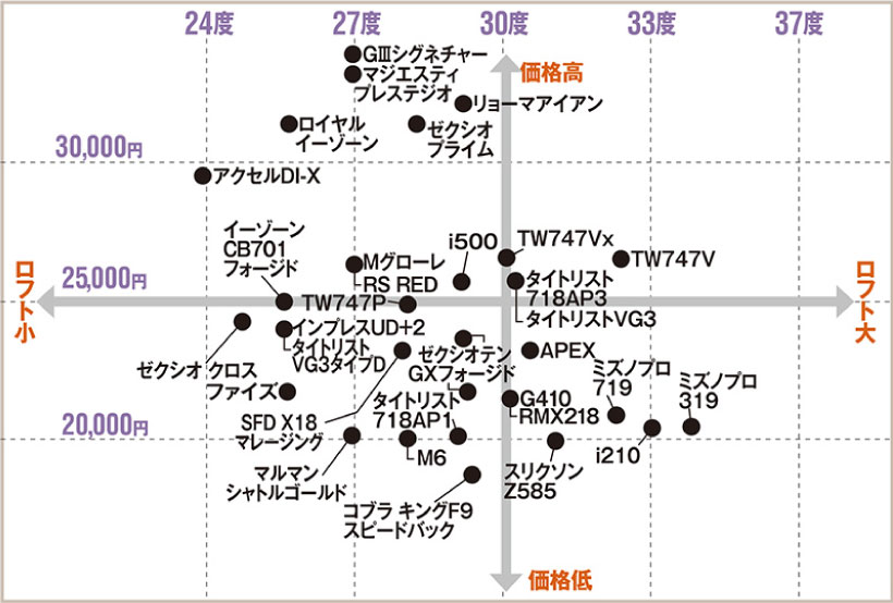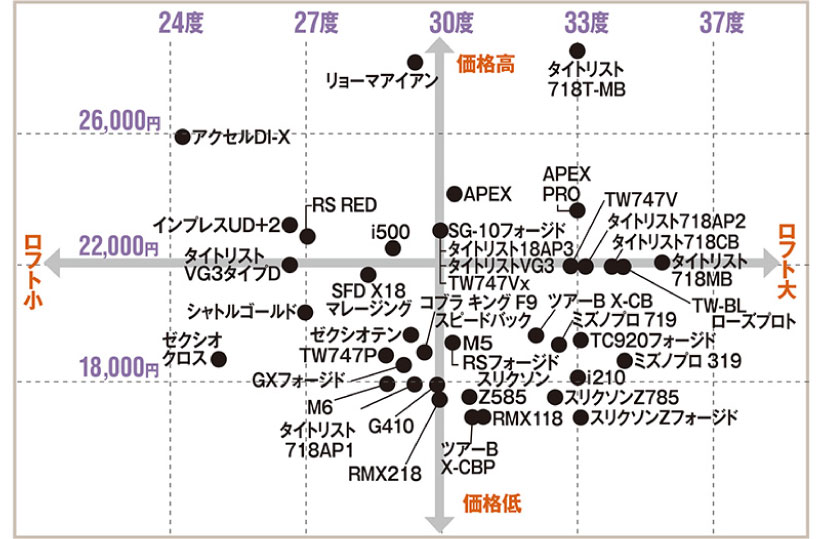 激飛びアイアンの出現で、同じ7番アイアンでもロフトは24度から35度までと大きな違いがある。今では軟鉄鍛造モデルでも7番でロフト30度が一般的だから、30度を中心にもっと飛ばしたいのか、距離よりもコントロール重視なのかでロフトを決めれば、自分にピッタリのアイアンはすぐに見つかる。