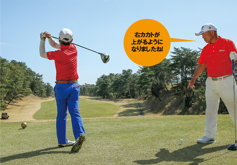クラブを短く持って大振りを解消し、ミート率がアップ。フィニッシュで右カカトを上げるイメージのおかげで、パワー効率がよくなり飛距離が20ヤード伸びた。