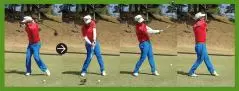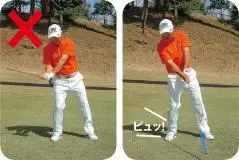 飛ばそうとしすぎるせいかトップがオーバースイング。体重が左足に乗らず、ボールにかすっただけのミスショットの結果に。フィニッシュも完全に右足体重だ。