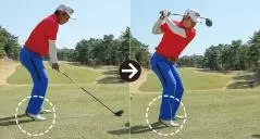 アドレスで右カカトを浮かせて構え、そのままフィニッシュまでスイングしよう。