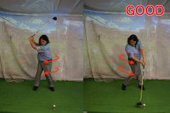 一般的にアマチュアの方がフィニッシュで崩れる場合、体主体でドライバーを回していないケース多いです。体の回転が止まって手振りになると、手に遠心力がかかって体が引っ張られ、体がヨタついてしまいます。