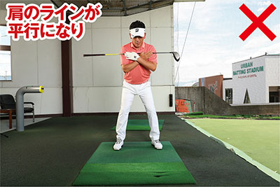 ラウンド中、疲れてきたり、ミスが続いたりすると、どんどん構えが縮こまって目線が低くなりがち。右肩が上がって両肩が水平な状態になり、ダウンスイングで上体が突っ込みやすくなってしまいます。