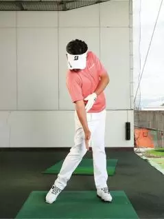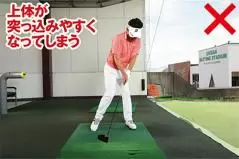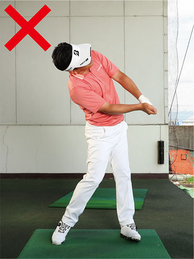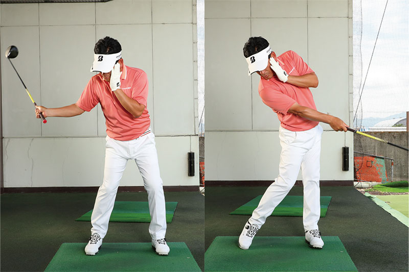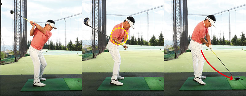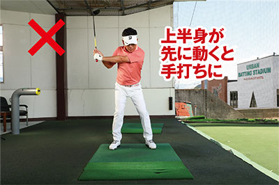 プレッシャーがかかって打ち急いだりリキんで上体が強くなると、切り返しで下半身が動き出す前に上半身が動いてしまうケースをよく目にします。これでは、手打ちになって溜めたパワーを効率よく発揮できず飛ばせないうえ、軌道も毎回バラバラになってしまい方向性も定まりません。