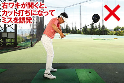 飛ばそうとして力んだり、プレッシャーがかかって手先で打ちに行くと、右手が強くなって右ワキが空きカット軌道になってミスを招いてしまうケースが多いもの。