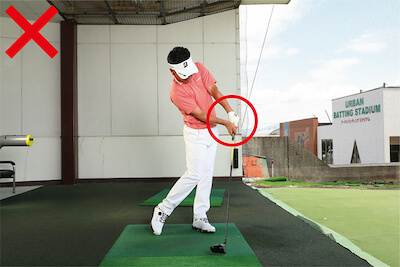 結果、クラブも上から入ってくる鋭角なスイング軌道になり、パワーをうまく伝えることができません。