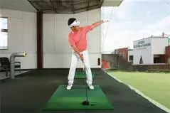 一生懸命振っているつもりでも、なかなか思うように飛ばせないという人にオススメなのが、この「クラブ回し振り」です。クラブの真ん中あたりをもって、くるくると回すだけ。これだけで、インパクト前後で必要な手首を返す動きを体現できるため、手早く正しい動きを体感することができて、球をビシッとつかまえて飛ばすことができるのです。
