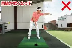 ラウンド中、疲れてきたり、ミスが続いたりすると、どんどん構えが縮こまって目線が低くなりがち。右肩が上がって両肩が水平な状態になり、ダウンスイングで上体が突っ込みやすくなってしまいます。