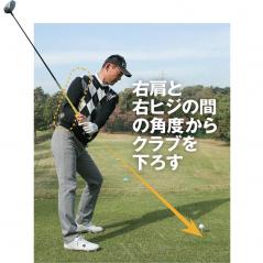 こうした悪癖を断ち切るには、シャフトを立てるイメージでダウンスイングするのがいいでしょう。垂直に立てて下ろすのではなく、飛球線の後方から見たときにクラブが右肩と右ヒジの間を通過するように、斜めの角度から下りてくるのが正しい動きです。