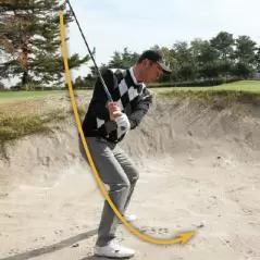 バンカーが苦手な人は大抵すくい打ちになっています。ダウンスイングでクラブが寝てしまうため、ボールの手前の砂をしっかり叩けないのです。脱出成功率を上げるには、シャフトを立てて振り下ろすこと。両ヒザを少し深く折り、ボールからやや離れてハンドダウンに構えるとスイングがタテ型の軌道となり、クラブを立てやすくなります。