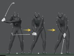 プロのダウンスイング。クラブは立っていないが、アマチュアに比べると手が体の近くに下りて、クラブがインサイドからボールに向かっていく。
