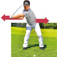 クラブの重心は後ろにありますから、ヘッドは体から遠いところを動きます。ここに体の回転が入ってくるのでクラブは自然にインサイドから下り、ヘッドが早く落ちることもありません。