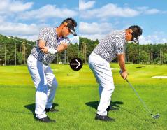 こうするとクラブヘッドは自分の背後に残ります。それに伴って腕とクラブでできる角度は鋭角になる。つまりタメができます。