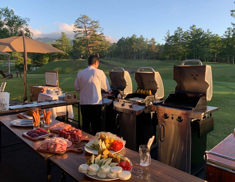 今回はロッヂに前泊してのラウンド。初日は午後に到着して練習場で練習(回り放題に行ってもいいしね)。そして夜はクラブハウス前でバーベキューを楽しみました。