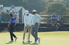 グリーン上では、パットを打つよりもフェアウェイを振り返ったり、グリーンの傾斜をジッと見つめて考えを巡らすことの多かったタイガー。2番ホールでの練習パットを終えた後、キャディとともにフェアウェイを振り返って、何かを確認しあうタイガー。