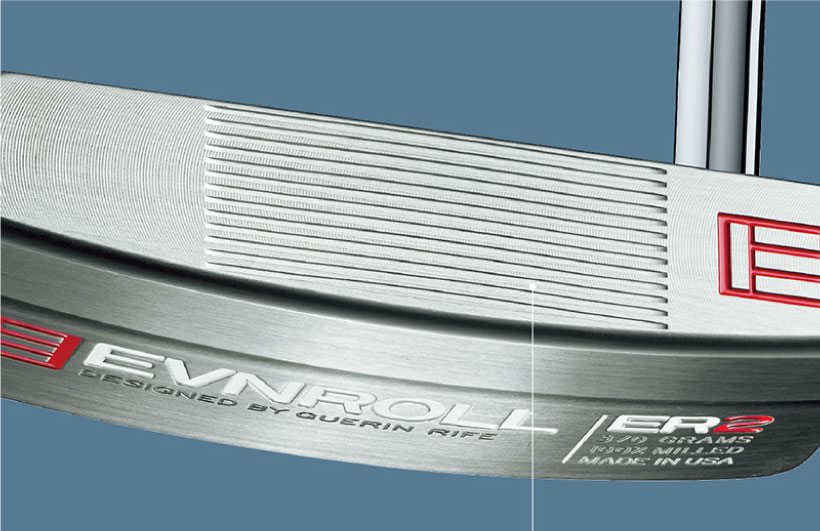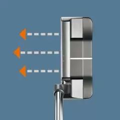 フェースセンターから外側に向けて幅と微細な突起の形状を変化させた溝が、オフセンターヒット時の、球の方向とコロがりのブレを抑制する。