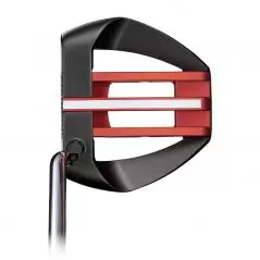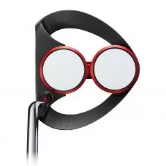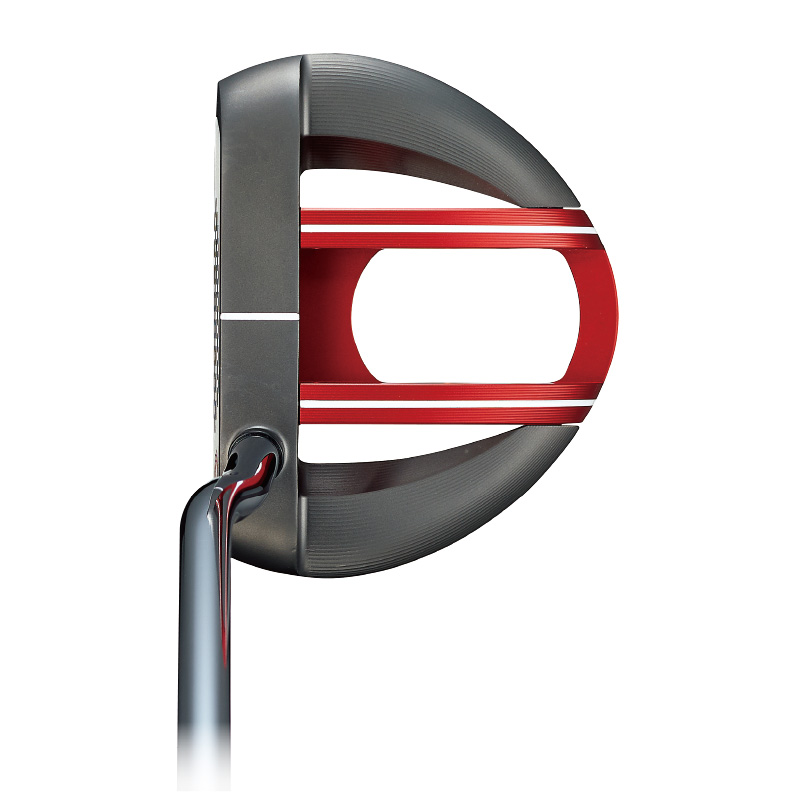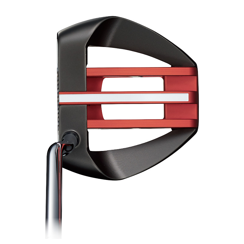 ヘッドの中央は比重の軽いアルミ(赤いパーツ)、ヘッド外周には比重の重いステンレスを使用することでヘッドの慣性モーメントを拡大。ソフトな打感と安定したコロがりを生むホワイト・ホット マイクロヒンジ・インサートとの相乗効果で、安定した方向性とコロがりが得られる。