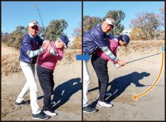 ヘッドをダフらせなければ、というイメージも強すぎて、クラブが急角度で下りてしまうだけでなく、右肩をかぶせてしまい、ヘッドもまたアウトから、かぶって下りてきてしまうのも、修正したいポイントです。