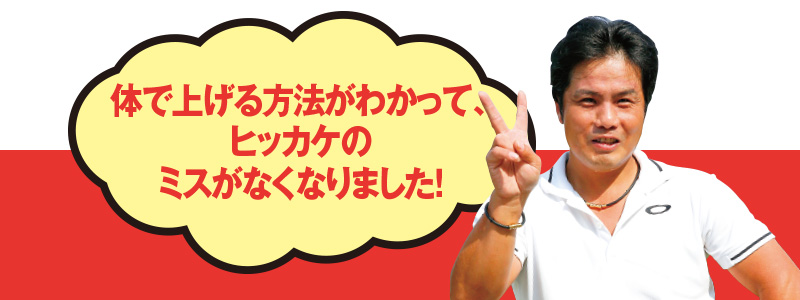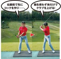 テークバックが「手上げ」になってしまう人は、右脚前で先にコックした状態を作り、左肩を入れるようにして上体でテークバックしてトップまで上げる。これを繰り返してコツをつかもう!