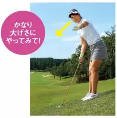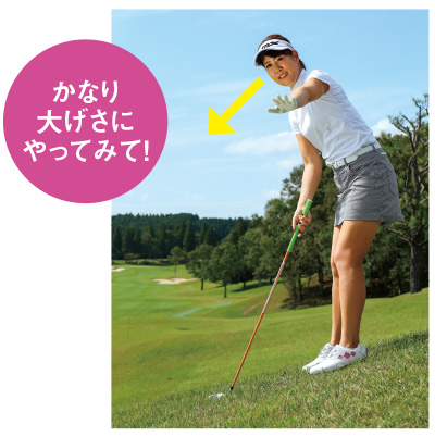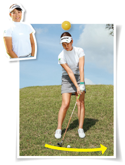斜面では足場のバランスが悪いので、フルスイングはやめましょう。トップは左腕が地面と平行、フィニッシュは右腕が地面と平行くらいです。