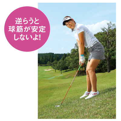 どんな傾斜でも逆らわずに構えること。そうしないと、自分が思っていたのと逆の球(逆球)が出たりしてします。