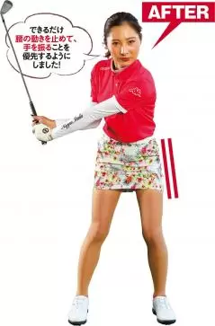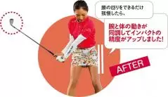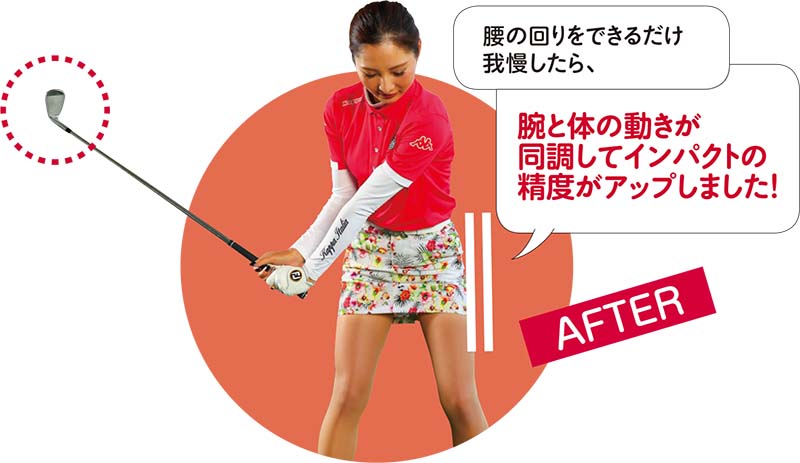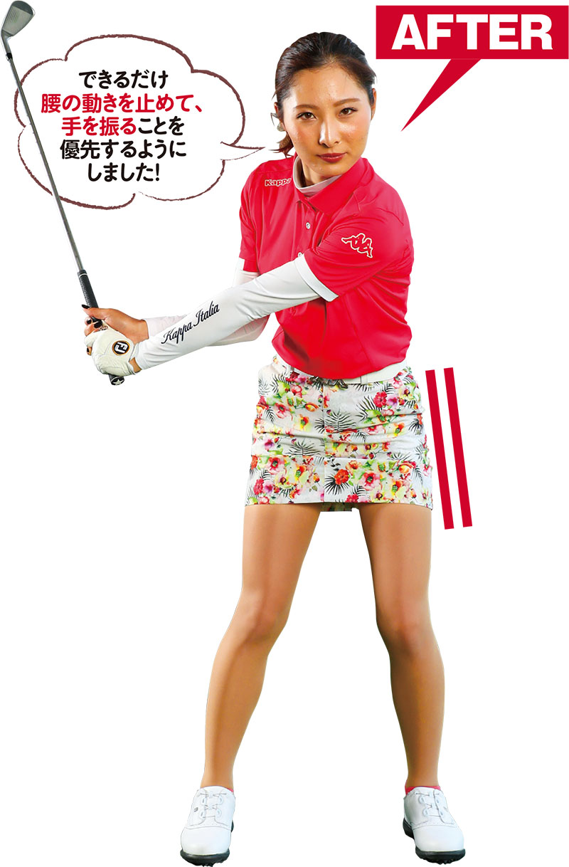 腰や体を正面に向けたままインパクトするイメージに変更。精度が増してミート率が上がることで、飛距離もしっかりキープ!