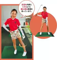 不用意に腰が早く回ってしまうのを抑えるには、左足でグッと踏ん張ることが大切。左足全体を内側にヒネるようなイメージで、左ヒザの位置をキープする意識を持つのがポイントだ。