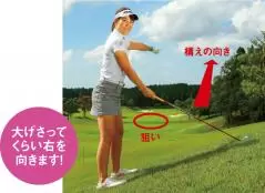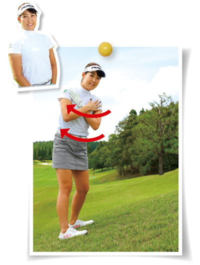 胸を後方に向けたまま ダウンスイングするのがコツ!!→ヘッドを上から球に当てようとしないこと!