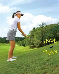 下半身は平らな地面の時に比べて傾斜がある時の方が回りにくいです。ですから、普段通りに打とうと思っても手打ちスイングになりやすい。手打ちになるとダフリやすくなってしまい、球は飛びません。