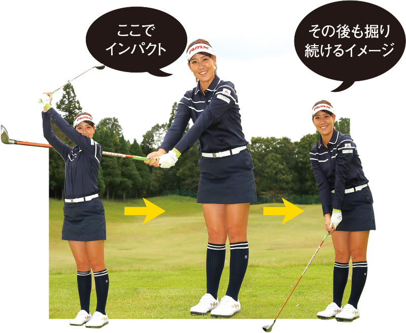 インパクトで終わりだと、減速が起こってからインパクトをしてしまうので、ユルんでしまいます。私たちプロは、皆さんが思っているよりも、インパクトの後、左足の前の地面を掘り続けるくらいの勢いを持って振っています。