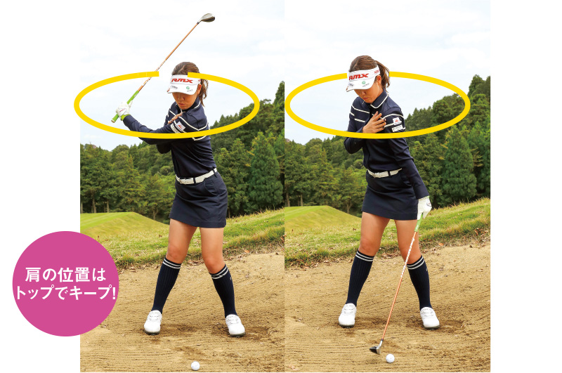 アドレスの時より上半身が右にいるイメージがあります。インパクトでヘッドと肩が引っ張られる感じもあるほど、肩はトップの位置に残したままで一切使わない。肩を回してしまうことで、上から叩き込んでしまいます。