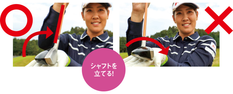 勘違いしやすいのが、「ロフトを立てる」って動き。ただ、フェースをかぶせることではなくて、私の中ではシャフトを立てることが「ロフトを立てる」です。