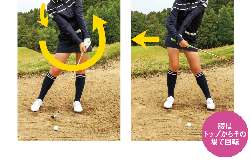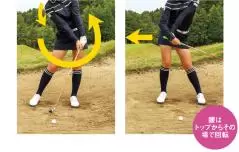 ダウンスイングで回転するのは腰だけのイメージです。腰は左に動いていますが、肩は残しているイメージなので、自然なハンドファーストになるんですよ。腰が引けちゃってたら、肩を残していてもハンドレート、になってしまいます。