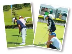 ぺ・ヒギョン(写真左)はボールの前にティを挿してパットの練習。ヘッド軌道を確認しているようだ。このように、グリーンにティを挿して練習をする女子プロは、とても多く見られる。