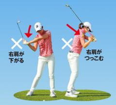オーバースイングになると右肩が落ちたり、つっこんだり