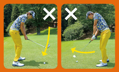 ヘッドを上から入れようとすると、右肩をつっこみやすくなります。すると、アウトサイドからヘッドが入ったり、それを修正しようと右肩を下げて合わせにいってしまうんです。