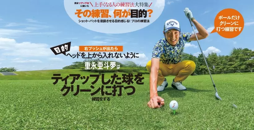 重永亜斗夢のゴルフ練習方法|右プッシュが出たらヘッドを上から入れないようにティアップした球をクリーンに打つ練習をする