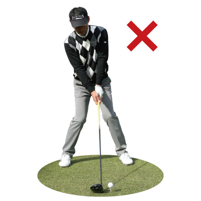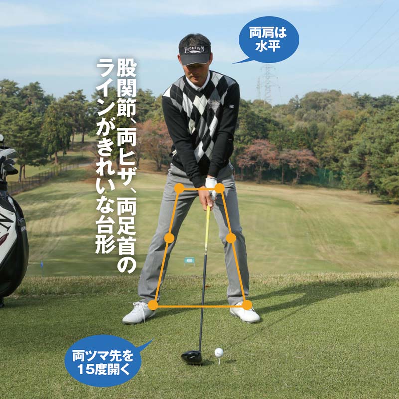 下半身は股関節、両ヒザ、両足首などの関節のラインが真っすぐとなるように構えましょう。下半身の三関節できれいな台形をつくるイメージです。両ヒザを内側に絞ると下半身のパワーが生まれず、インパクトが安定しません。両肩は平行にセットします。