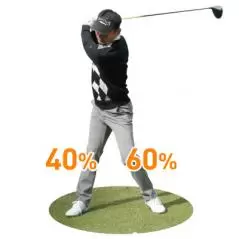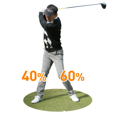 バックスイングでは右足を伸ばしながら左足への荷重を少し強め、切り返しでは体重の60パーセントが左足に乗る。
