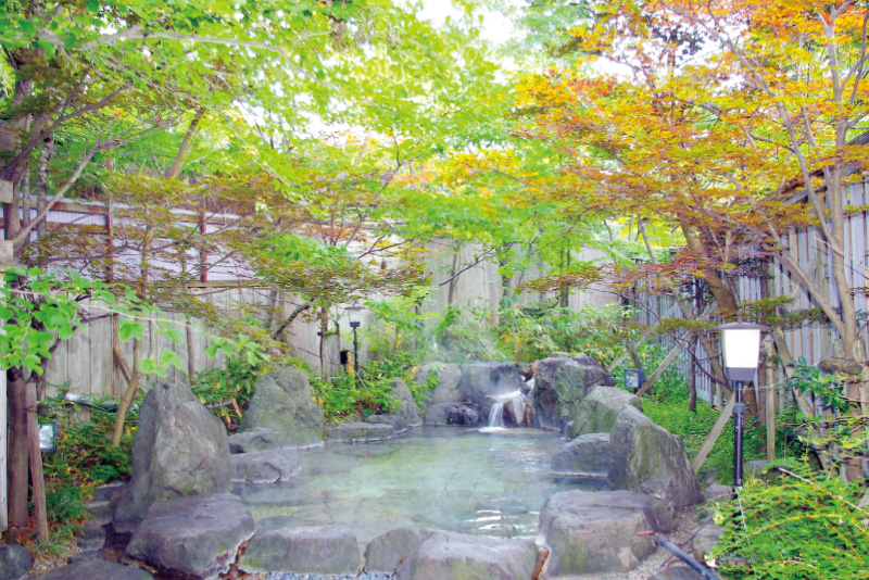 併設ホテルの露天風呂は、四季の自然を感じつつ疲れを癒してくれる。