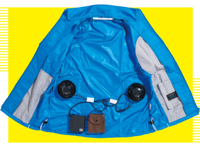 背面についた2つのバッテリーつきファンから外気を取り込み、ウェア内の空気を襟元と袖口から排出する構造になっている。単に風が涼しいだけでなく、汗が蒸発する際の気化熱が体をさらにクールダウン。透湿性や撥水性に優れ、紫外線を99%カットするUPF50+の機能素材を使用。