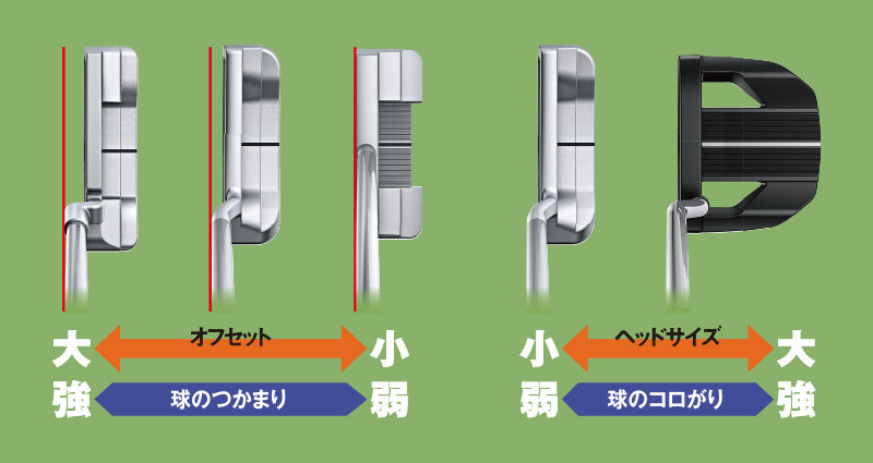 最終的には、形も方向性も距離感も実際に打って“しっくり”来るものがベストですが、パターの種類は膨大な数がありますから、まずは、球のつかまり加減をオフセットで、球のコロがりの強さをヘッドサイズで候補を絞り、打ち比べてしっくりくるものを選ぶといいでしょう。