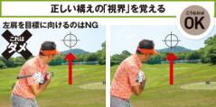 スクエアに構えて目標方向を見たとき、左肩がやや開いて見える。体が左を向いているように感じて左肩を目標に向けようとすると体が右を向くので注意。