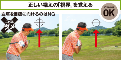 スクエアに構えて目標方向を見たとき、左肩がやや開いて見える。体が左を向いているように感じて左肩を目標に向けようとすると体が右を向くので注意。