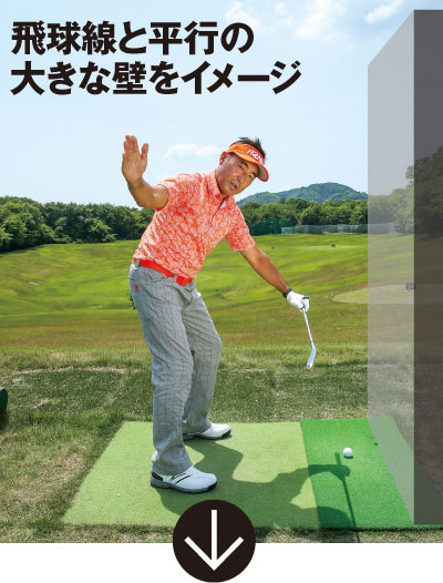 飛球線は通常はラインのイメージですが、飛球線のすぐ前に大きな壁があると考えましょう。すると手を壁に当てないように、クラブをインサイドから下ろし、インサイドに振り抜きやすくなります。