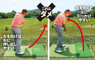 マットの向きと違う方向を向くとマットのラインが視界に入り、違和感が生じてしまいがち。右を向いて構えると左に引っ張りたくなるし、左を向くと右に振ろうとしてフェースが開きやすい。